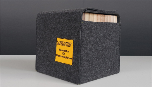 Zur Verkaufsförderung bieten wir zwei praktische Musterboxen aus Filz mit je 10 Holzarten – im Format 200 x 200 x 19 mm an.